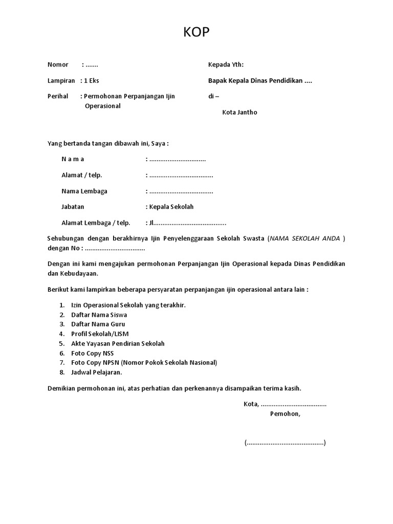 Pokja pemilihan menetapkan kriteria evaluasi teknis memiliki pengalaman paling kurang 1 (satu) pekerjaan jasa konsultansi konstruksi dalam kurun waktu 4 (empat) tahun terakhir, baik di lingkungan pemerintah maupun swasta termasuk pengalaman subkontrak. Untuk melakukan perpanjangan ijin operasional sekolah memang memiliki kriteria tertentu berdasarkan pada aturan yang telah di tetapkan oleh diknas adapun untuk daftat format pengajuan perpanjangan ijin operasional ini beberapa dokumen yang harus di persiapkan antara lain Persyaratan izin pendirian paud 2. Ijin operasional madrasah format pm04. Perpanjangan ijin penyelenggaraan sekolah swasta. Foto copy piagam perpanjangan documents similar to permohonan perpanjangan ijin operasional. Permohonan izin operasional paud di jakarta 3. Menjabarkan secara operasional kegiatan administrasi pendidikan yang tercantum dalam buku pedoman administrasi dan supervisi. Izin operasional, profil sekolah, sk pengangkatan kepala sekolah dan surat usulan izin memimpin yang diketahui oleh yayasan penyelenggara satuan pendidikannya, nama tersebut: Kak,mohon bantuannya utu contoh membuat sop sekolah music. Persyaratan peserta ujian nasional 1. Merdeka belajar adalah kebijakan besar dalam rangka mewujudkan transformasi pengelolaan pendidikan di indonesia. Peserta didik telah atau pernah berada pada tahun terakhir pada.