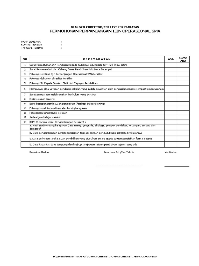Persyaratan Ijin Operasional Smk P2t Xls 1 Xlsx Checklist Penerbitan Kelengkapan Permohonan Perpanjangan Ijin Operasional Smk Nomor Penerima Berkas Course Hero from www.coursehero.com Ini lho persyaratan perpanjang paspor yang benar. Meliputi sekolah menengah pertama/madrasah tsanawiyah (smp/mts), sekolah menengah pertama teologi kristen (smptk), sekolah menengah pertama a. Entri ini ditulis dalam akreditasi sekolah, file sekolah, inventaris sekolah, smp negeri 51 batam oleh pardomuan sitanggang. Penunjukan langsung adalah metode pemilihan untuk mendapatkan penyedia barang/pekerjaan konstruksi/jasa konsultansi/jasa lainnya. Permohonan izin operasional paud di jakarta 3. Persyaratan izin operasional sekolah swasta (tk, sd assalamualaikum. Definisi, cara memembuat standar operasional prosedur (sop) beserta contoh dan flow chart nya. 1 berkas permohonan perpanjangan ijin penyelenggaraan sekolah swasta sma kertajaya1.