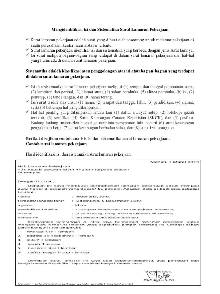 Jelaskan Sistematika Surat Lamaran Pekerjaan : Kumpulan Bentuk Bentuk Surat Lamaran Kerja Beserta Contoh : Sistematika surat lamaran pekerjaan (buku bhs indonesia kemdikbud 2018) untuk pptnya dapat di unduh pada link.. 2 sistematika surat lamaran pekerjaan. Surat lamaran pekerjaan biasanya bersifat resmi atau formal dari seseorang yang membutuhkan pekerjaan, contohnya surat lamaran kepada bank bri untuk menjadi karyawan bank tersebut. Materi dalam video ini bersumber dari buku bahasa indonesia (buku siswa) kelas xii untuk sma/ma dan smk/mak kurikulum 2013 edisi revisi 2018, terbitan. Seperti yang telah diutarakan sebelumnya. Identitas diri (nama lengkap, umur atau tempat dan tanggal lahir, alamat) jabatan yang diinginkan kualifikasi (pendidikan, keahlian, atau pengalaman).